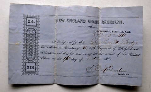 This certifies that Le Baron Monroe Patridge (actually Partridge) has enlisted in Company G, 24th Regiment of Massachusetts Volunteers, and he was sworn into the service of the United States of the 16th day of October 1861. Signed, E. B. Richardson.