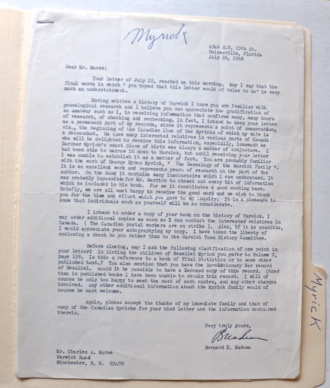 File consists of several letters from Bernard Nadeau written around 1968 to Charles Morse. He asks for information about Gardner Myrick, Bezaleel and Barnabas Myrick. One sheet of Charles Morse notes.