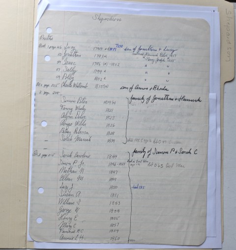 Several Shepardson families lived in Warwick. This file consists of a handwritten sheet by Charles Morse of family members of Jonathan and Lucy, Jonathan and Hannah and Simon P. and Sarah C. Listed are children of all with birthdates referenced with book and page. A few deaths are listed on the reverse side of paper.