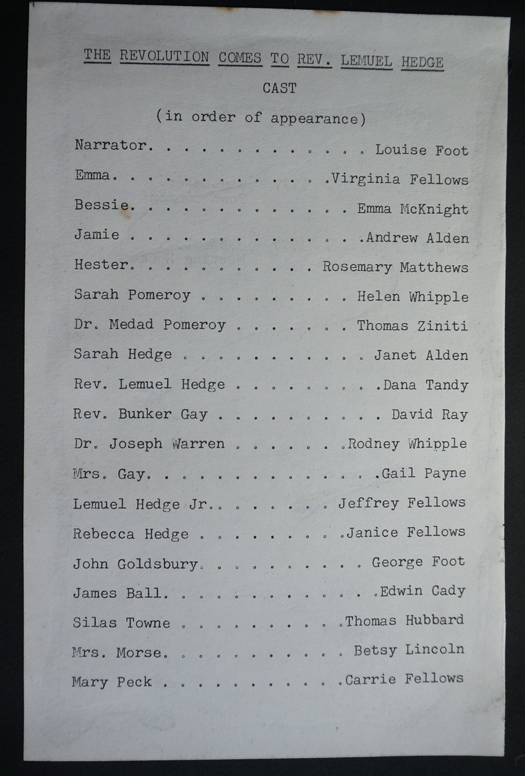p.7: Cast in order of appearance of the Revolution Comes to the Reverend Lemuel Hedge