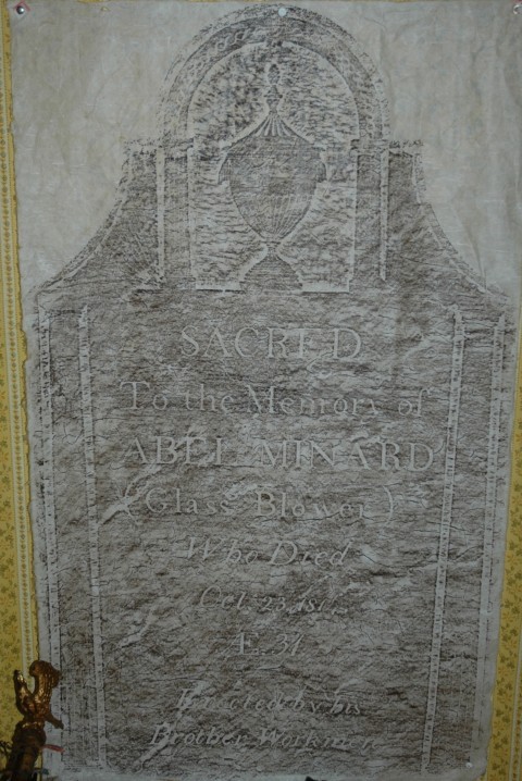 Artwork Room 1A A gravestone rubbing on the north wall of room 1A of Abel Minard (Glass Blower) who died Oct 23, 1814, erected by Brother Workmen Approximate era don't know