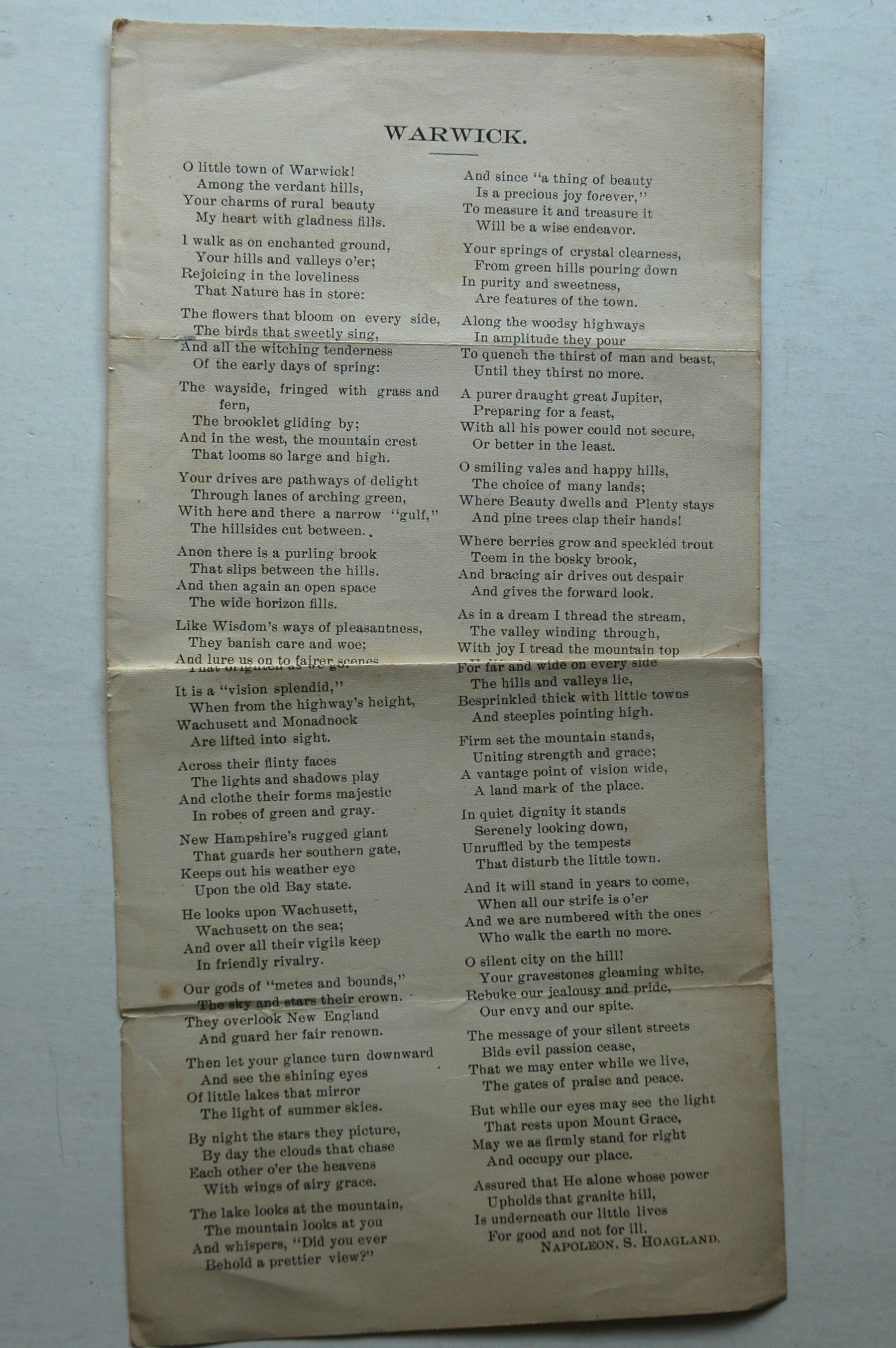 A single page poem entitled "Warwick" written by Napoleon S. Hoagland