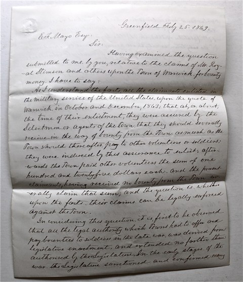 Letter dated July 1869 from Samuel Lamb explaining the claims of Royal Stimson and others upon the town of Warwick for bounty money.
