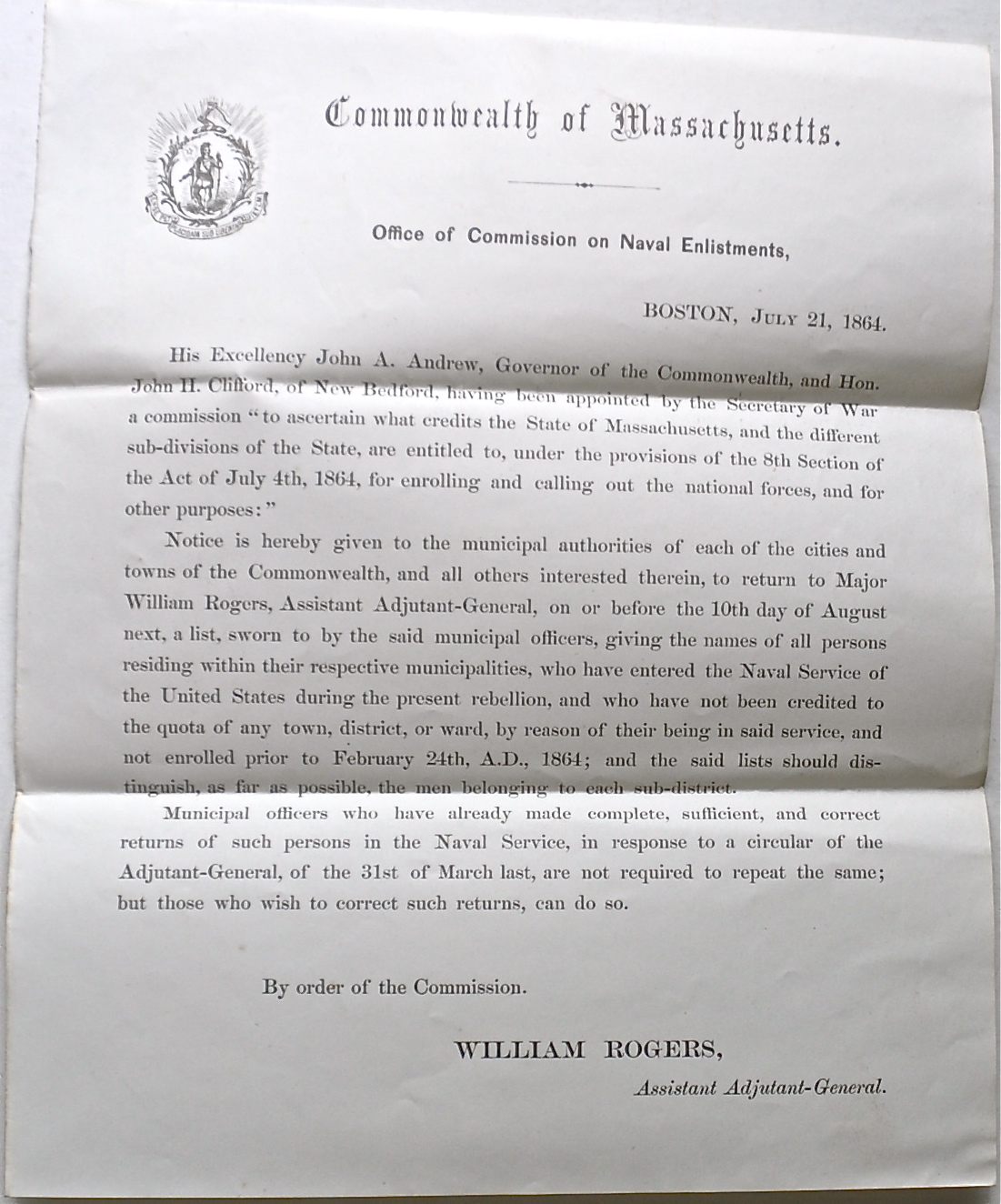 A request from Assistant Adjutant-General William Rogers requesting before August 10th a list of "all persons residing within their respective Municipalities, who have entered the Naval Service in the present rebellion."