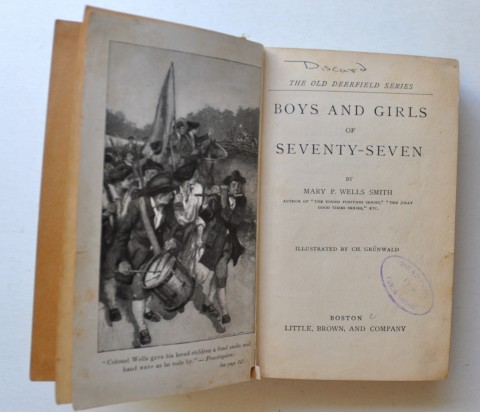 Smith, Mary P. Wells; Boys and Girls of Seventy-Seven; Boston; Little, Brown, and Company; 1909. Part of The Old Deerfield Series. Illustrated by Ch. Grunwald.