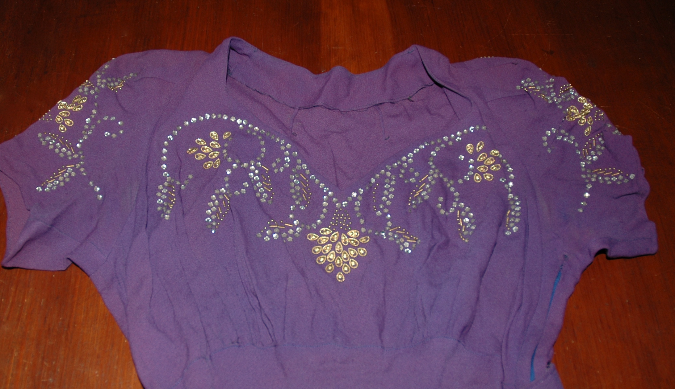 Women's evening dress of purple crepe fabric with extensive rhinestone and sequin beading on bodice. Empire waist, sweetheart neckline. Separate purple crepe belt at empire waist seam. Talon zipper at side.